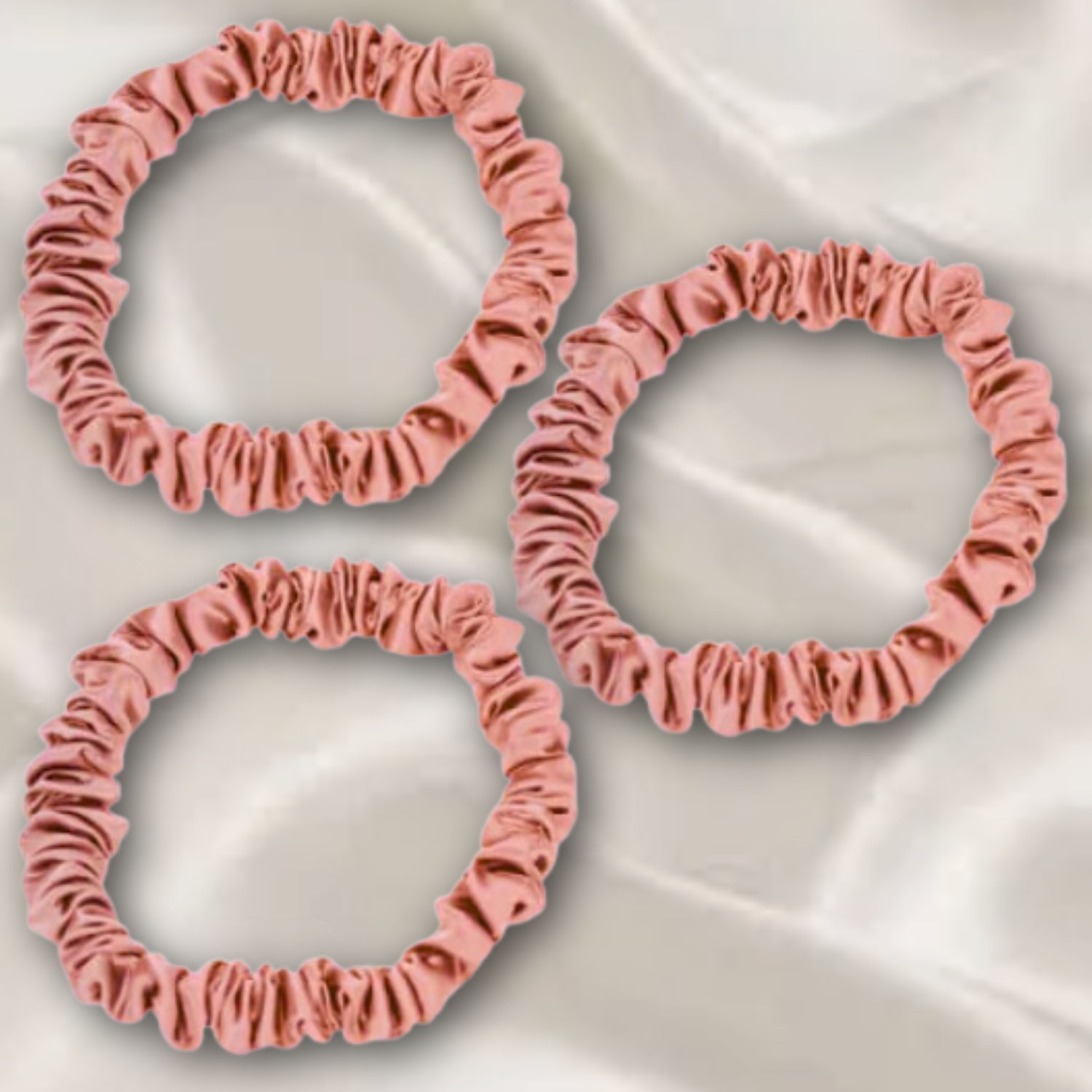 This set of 3 satin scrunchies (pink, gold, black) is adorable. They are thinner and have a smaller circumference than the scrunchies I generally use, but may work well for thin hair or children. They are soft, well sewn with no loose threads, and the colors I expected based on the product photos. I think they could also be a good choice for someone with more texture to their hair, or who is willing to wrap them tighter than I find comfortable.